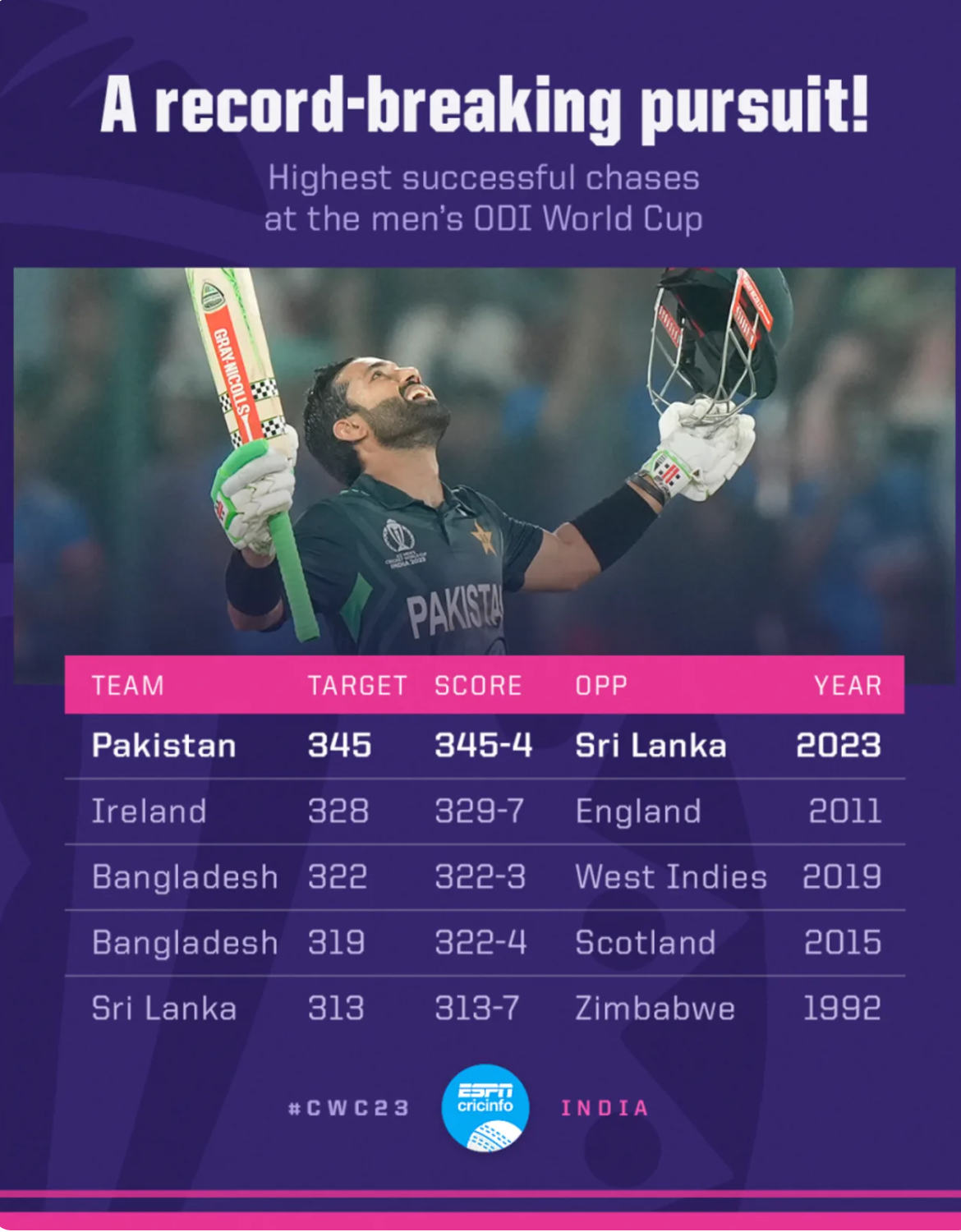 And while on paper the 2023 Pakistan team is one of the best we’ve ever had, boasting the worlds best batsman and as always, some of the worlds greatest bowlers, they’re still criticized for not winning big matches and lacking that competitive edge Pakistan cricket fans have historically expected. But they proved naysayers wrong today by comfortably blowing through ODI World Cup records and chasing down the highest total in history by scoring 345 against Sri Lanka – with 6 wickets in hand no less.